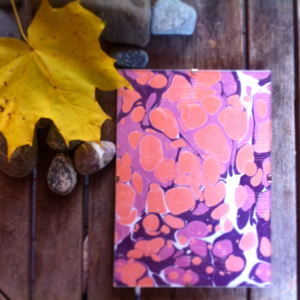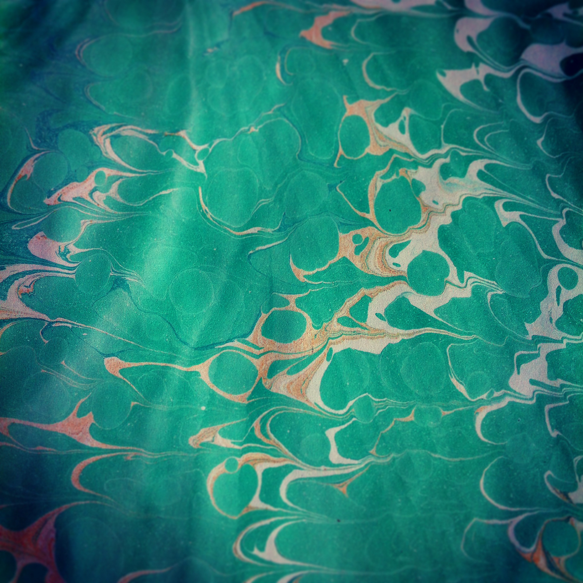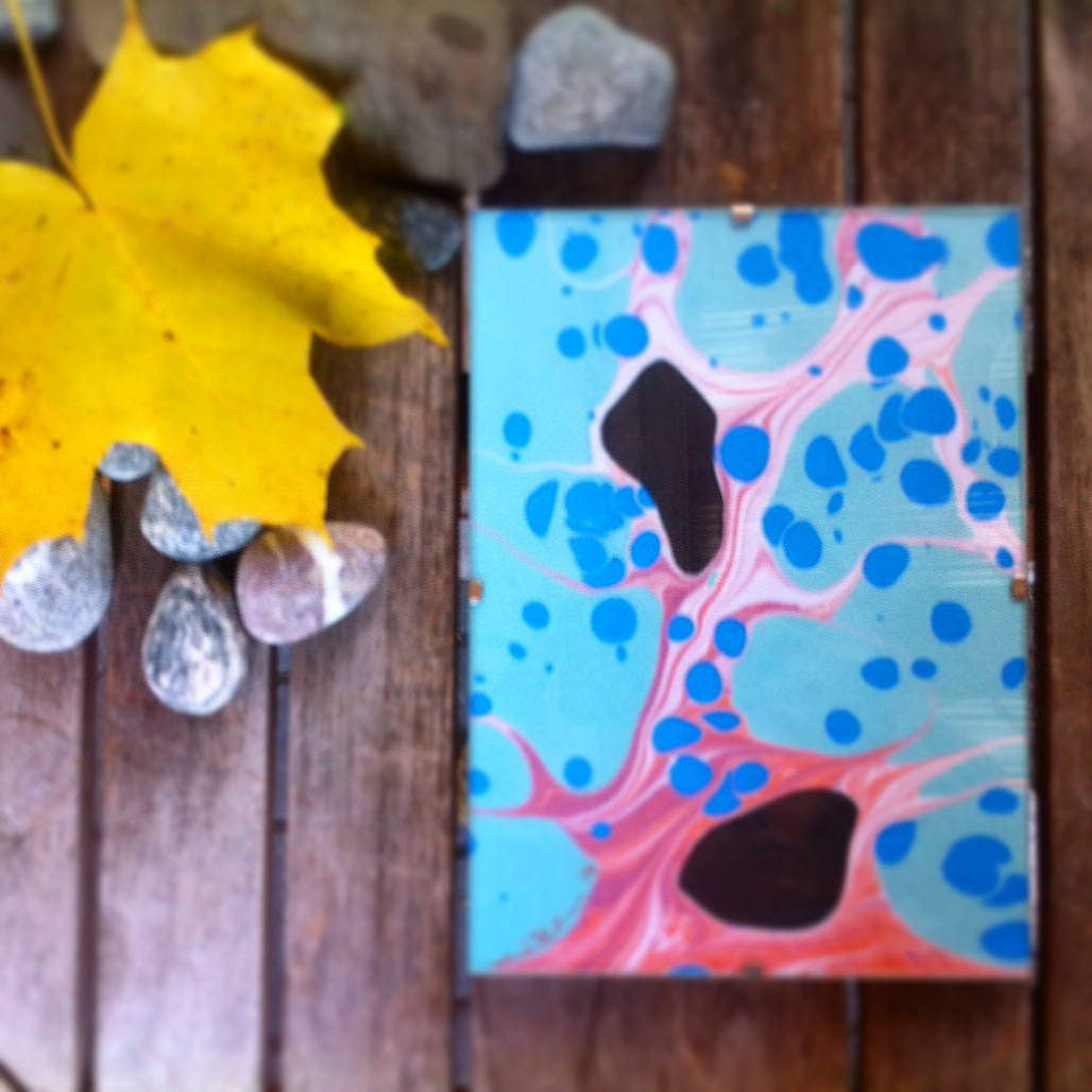 Marbling has a relaxing effect due to the usage of natural materials such as water, earth dye, branch of rose, a resin that is taken from thorn of wild licorice, buffalo bile*, horse hair*.